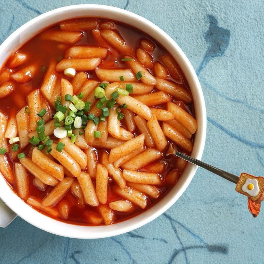 Topokki coreean autentic cu sos dulce-picant, perfect pentru iubitorii de street food asiatic. Textura moale a prăjiturii de orez combinată cu aroma intensă oferă o experiență culinară rapidă și satisfăcătoare, direct din Coreea.